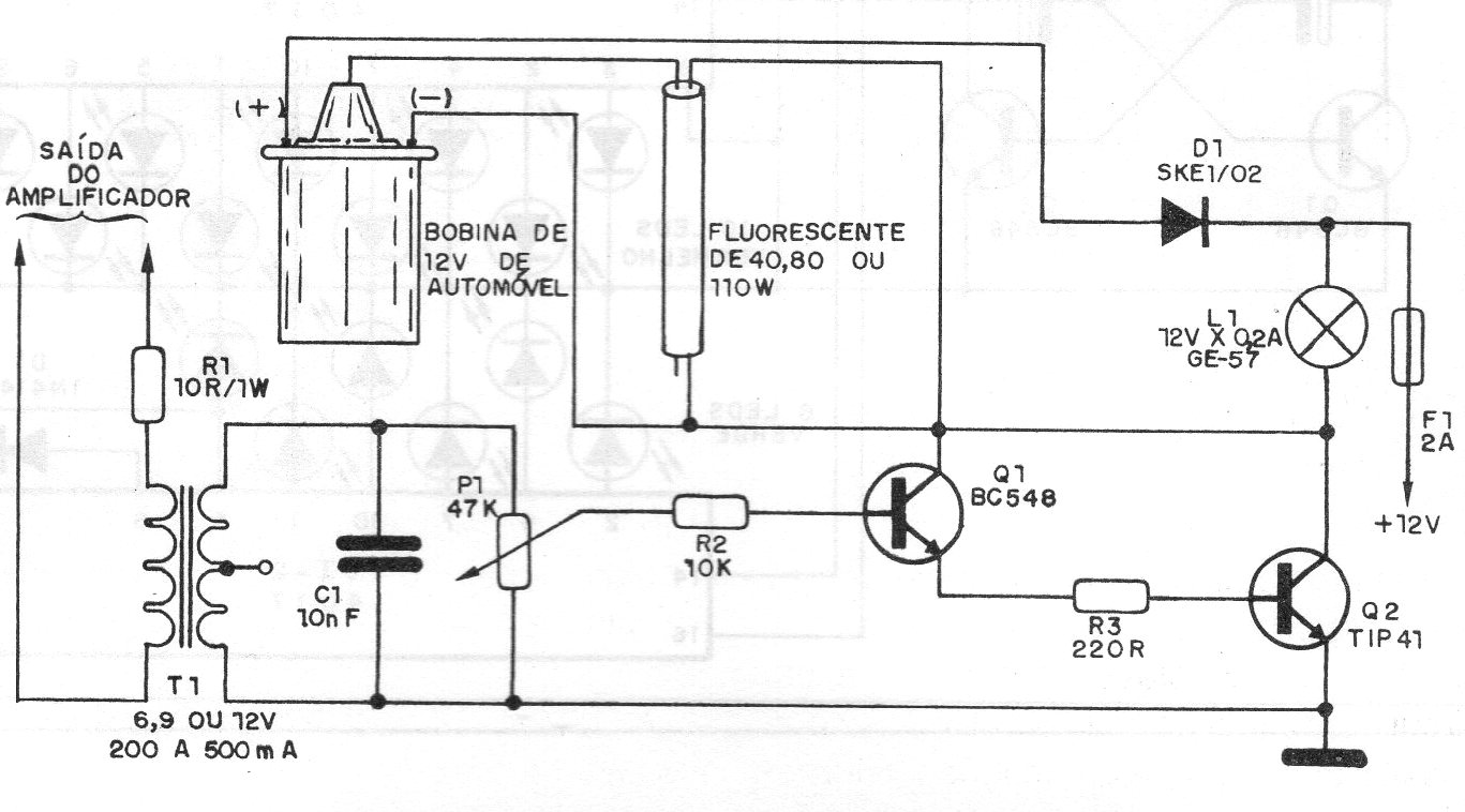 Este circuito de 1987 utiliza una bobina de encendido común para generar la alta tensión para alimentar una lámpara fluorescente que parpadea con la música. Se utiliza un pequeño transformador de fuerza para aislar la salida del amplificador y obtener la tensión de excitación del circuito. La lámpara puede tener de 5 a 40 watts.