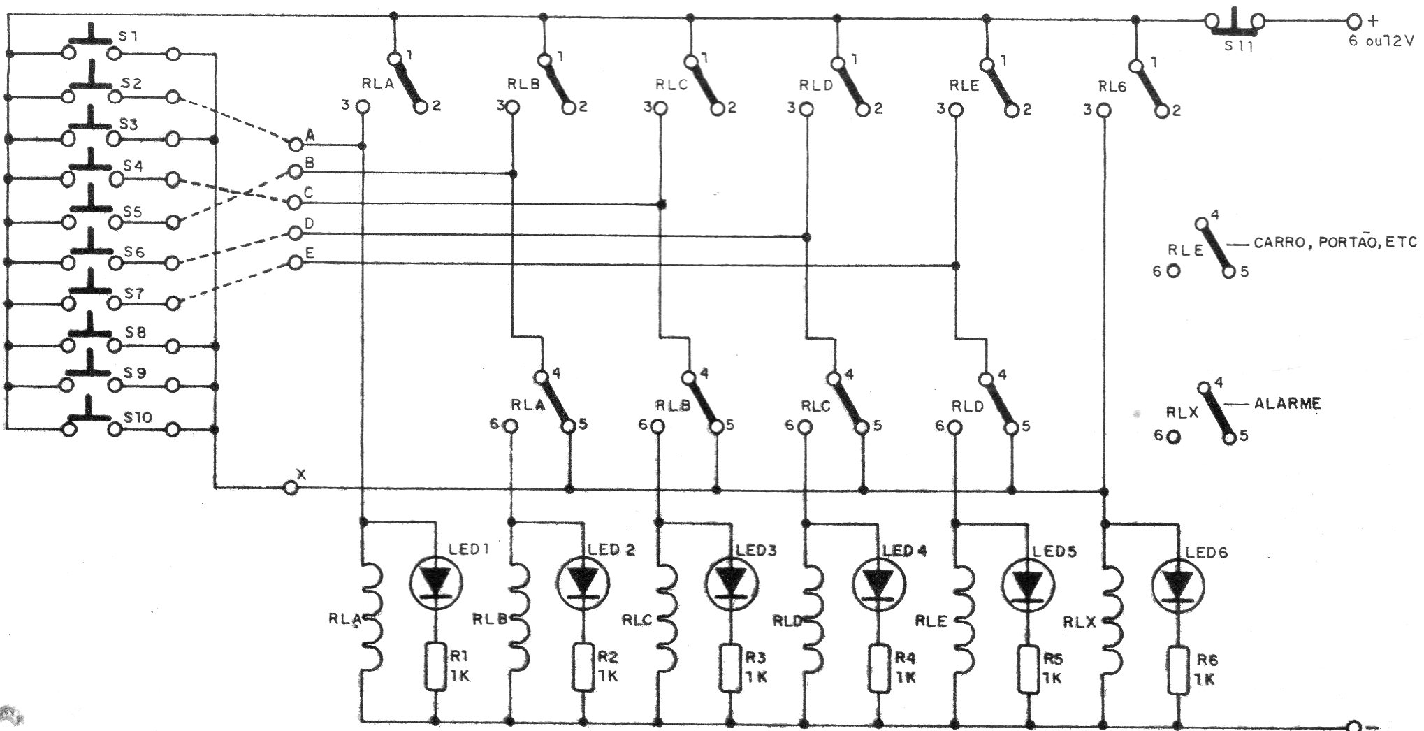 Este circuito, que se puede utilizar con seguridad, se obtuvo en una documentación de 1987. Se trata de un sistema de relés que pueden tener el accionamiento programado a través de llaves. Las tensiones de los relés dependen de la tensión de alimentación del circuito. La programación se realiza a través de puentes.