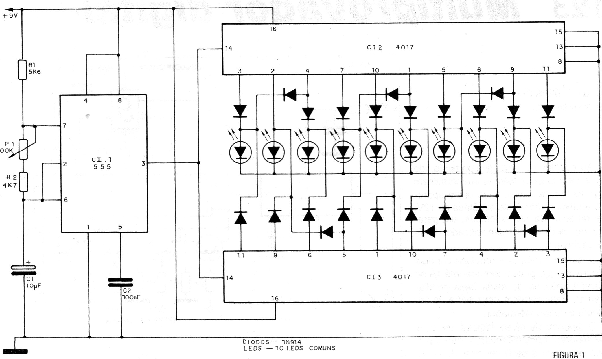 Este circuito fue encontrado en una publicación de 1987, consistente en un accionador secuencial doble para conjuntos de LED. La conexión programada por los diodos hace que los LED parpadeen de forma imprevisible. El circuito puede ser alimentado por tensiones de 6 a 9 V. P1 es de 100k.