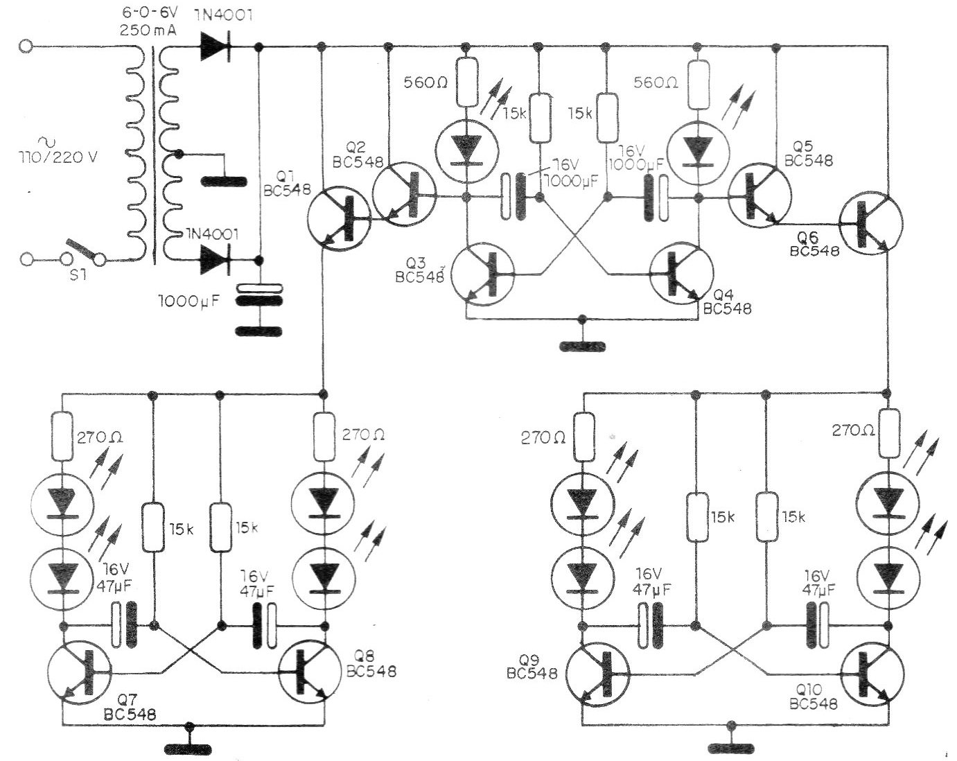 Hemos encontrado este circuito que utiliza sólo transistores en una publicación de 1992. Las frecuencias de los multivibradores determinan los efectos, pudiendo los capacitores correspondientes ser alterados en una amplia gama de valores. Los LED pueden ser de colores diferentes y más multivibradores se pueden añadir al diseño original.
