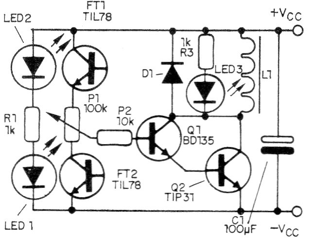 Este interesante circuito de una publicación de 1992 exige mucha habilidad mecánica para el montaje. Él mantiene una bolita de metal suspendida por un fuerte campo magnético, como muestra la figura. El ajuste es crítico y la alimentación debe venir de fuente de 12 a 24 V con al menos 3 A. La bobina está formada por al menos 1 000 espiras de hilo esmaltado 28.
