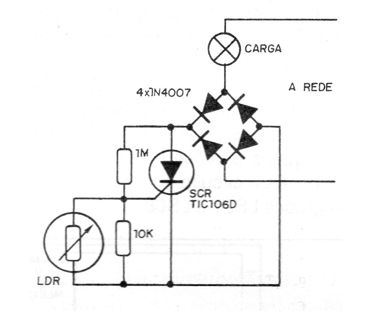 Esta es una de las muchas configuraciones posibles para encender una lámpara cuando se oscurece mediante un SCR y un LDR. Los resistores determinan la sensibilidad del circuito y el SCR, y dependiendo de la potencia de la lámpara, debe montarse en un disipador de calor.