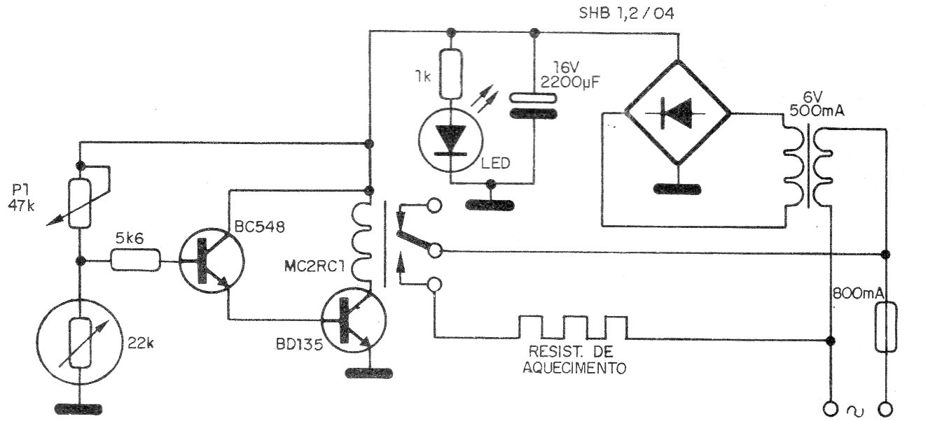 Este circuito de 1992 se basa en un NTC para encender y apagar de forma intermitente un elemento de calentamiento de acuario. El circuito utiliza un NTC de 22k y activa un relé de 6 V sensible. La fuente de alimentación para el sector de baja tensión está incluida. P1 ajusta la temperatura.