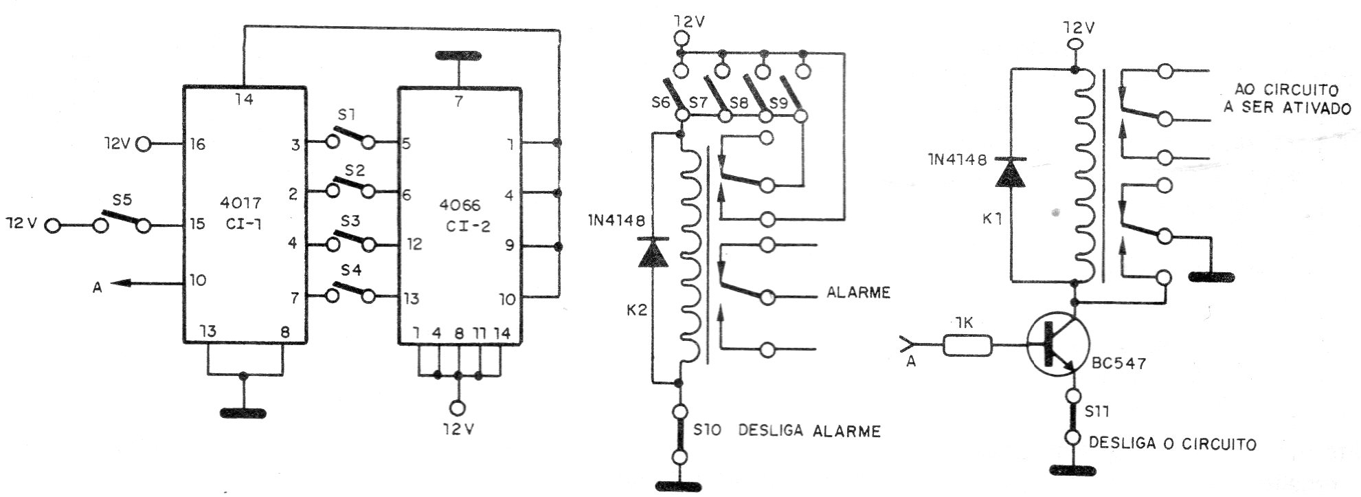 Encontramos este circuito en una publicación de 1992. El circuito habilita secuencialmente un conjunto de llaves de modo que al final pueda ser accionado un relé. La alimentación debe realizarse con tensiones según el relé utilizado. Si se activan otras llaves fuera de la secuencia, la alarma se dispara.