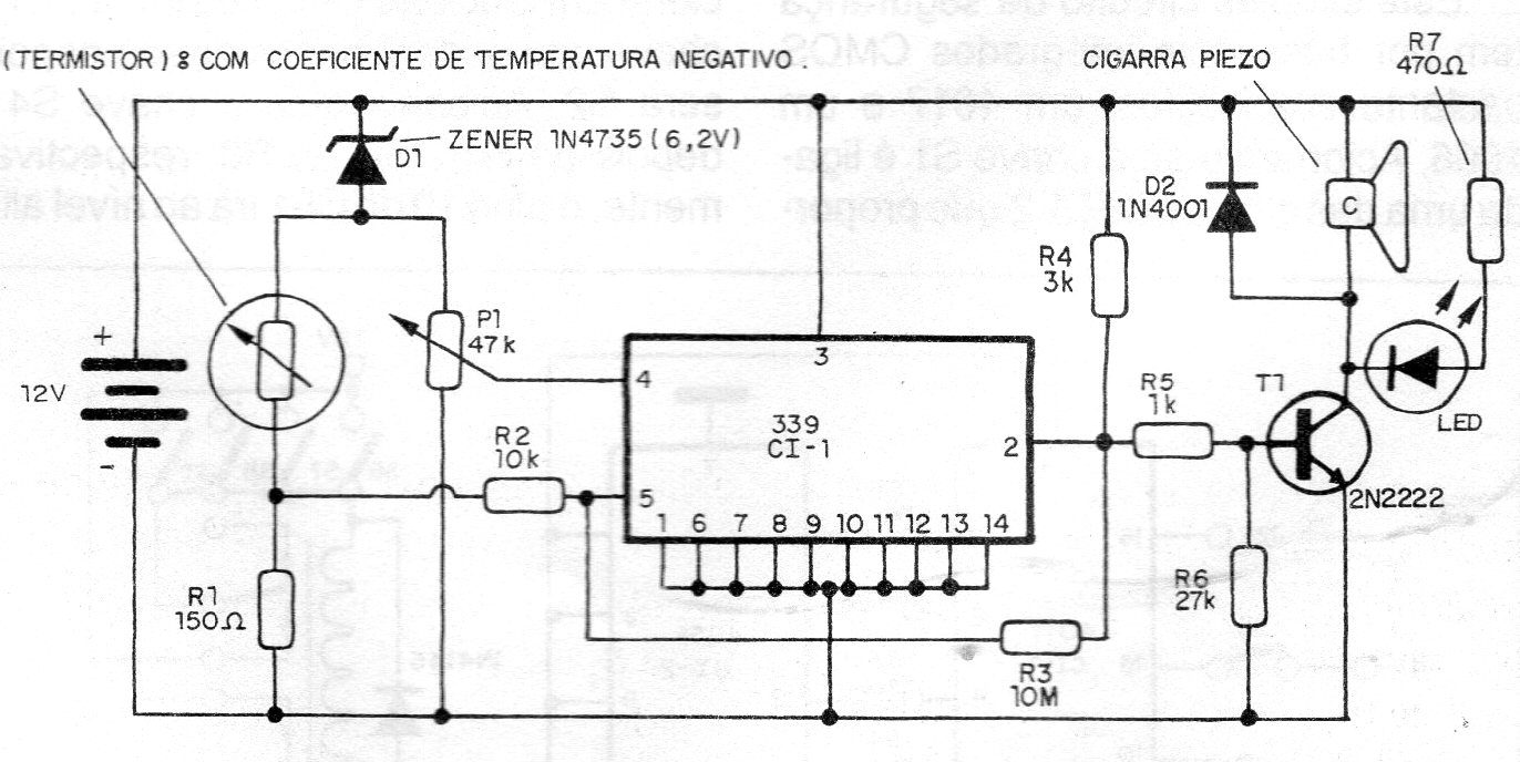 Este circuito activa un oscilador de advertencia cuando se supera la temperatura ajustada en P1. El oscilador en realidad es un Sonalert u otro bocina que ya incluye el circuito de sonido. La alimentación se realiza por tensión entre 9 y 12 V.