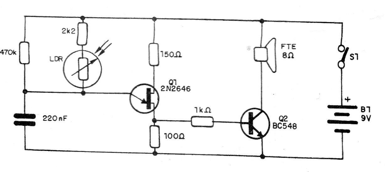 Esta es más de las configuraciones posibles para transistores unijunción como oscilador controlado por la luz. El sensor es un LDR común y la tensión de alimentación, de hecho, puede quedar entre 6 y 12 V. La frecuencia puede ser modificada con el cambio del capacitor.