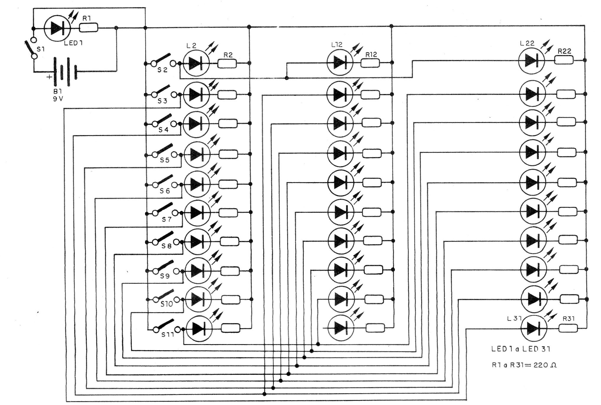 Este interesante circuito, que encontramos en una documentación de 1992, puede ser de gran valor para profesores de la enseñanza fundamental que necesitan enseñar la tabla del 9 para alumnos que tengan dificultades. El circuito utiliza LEDs y llaves de programación, siendo alimentado por pilas comunes. Se selecciona la clave para el valor a ser calculado y el resultado aparece en los LEDs encendidos.