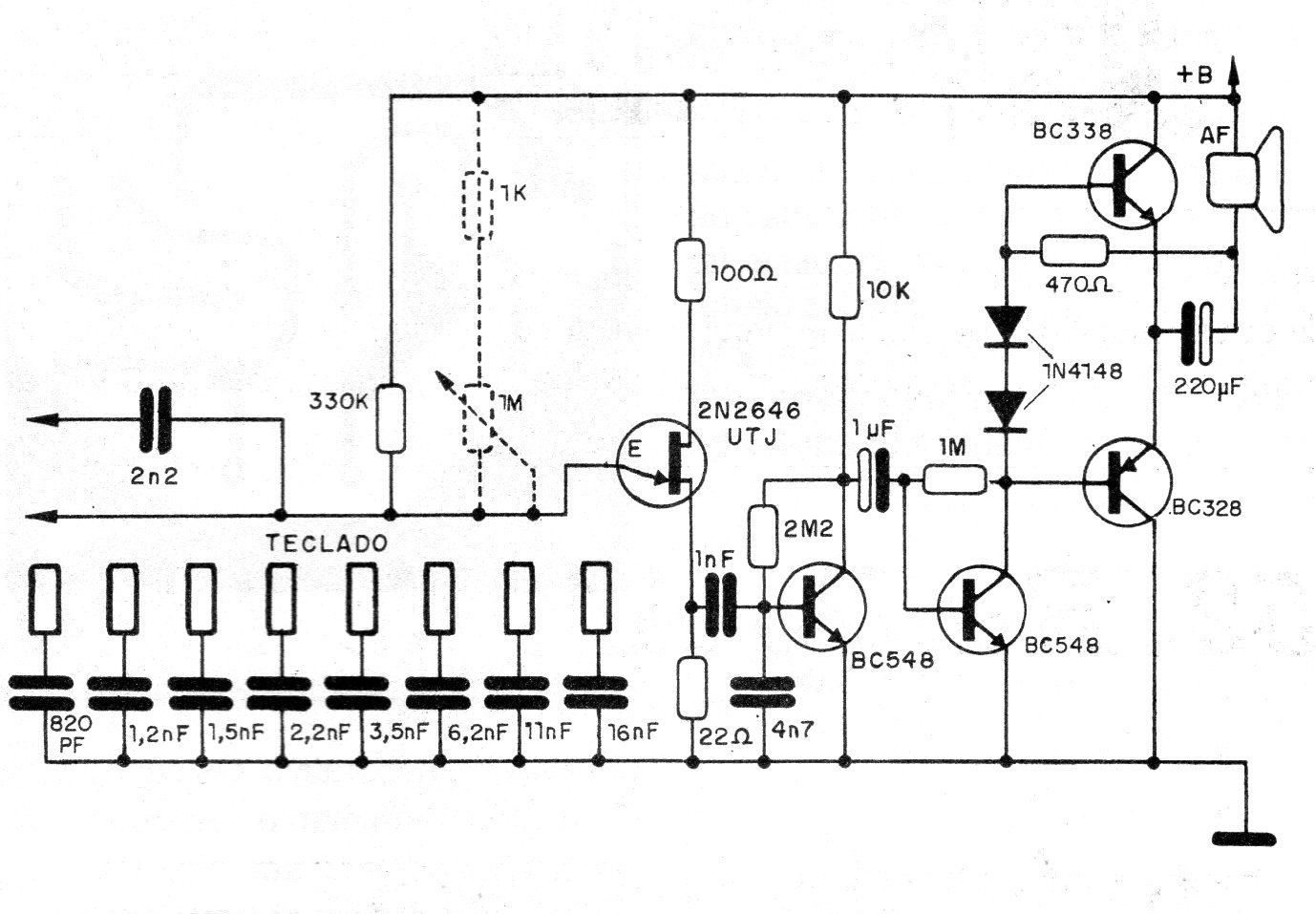 Este circuito de 1992 incluye un amplificador de audio. El oscilador se realiza sobre la base de un transistor unijuntura y cada tecla tiene un condensador que determina la frecuencia de la nota. La alimentación se realiza con una tensión de 6 a 12 V que, preferentemente debido al consumo debe ser hecha a partir de una pequeña fuente de alimentación.