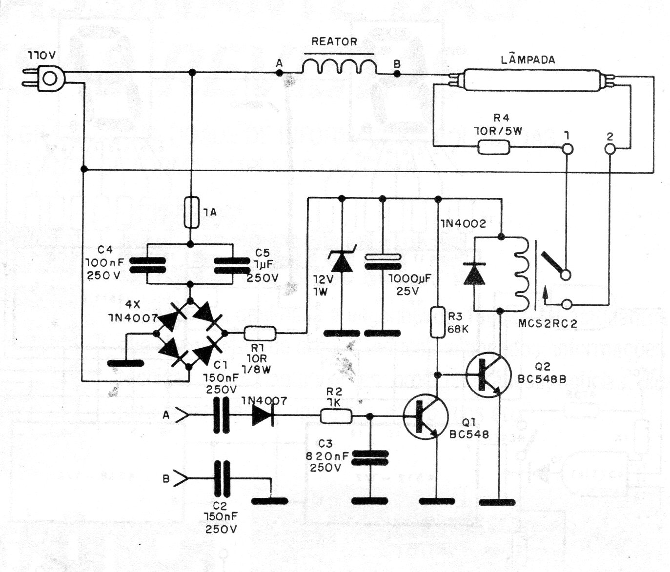 Con este circuito es posible controlar una lámpara fluorescente con señales provenientes de un amplificador u otra fuente de señal. El relé debe ser de 12 V con corriente de accionamiento de 50 mA o menor y los demás componentes son comunes.