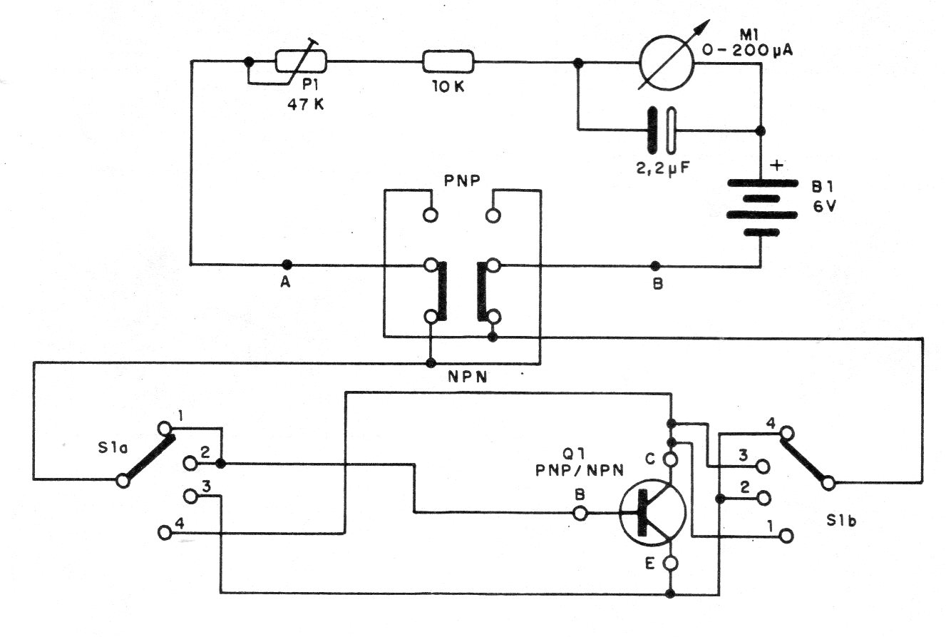Encontramos este circuito en una documentación de los años 90. Se trata de una simple prueba para transistores NPN y PNP además de otros componentes, ya que se pueden realizar pruebas de unión. El circuito es alimentado por pilas y el indicador es del tipo analógico con 200 uA de fondo de escala.