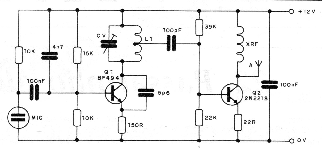 Este pequeño transmisor de 2 transistores puede alcanzar varios cientos de metros usando una antena de 30 a 70 cm. La alimentación debe de batería o fuente y el micrófono es de electreto de dos terminales. L1 consiste en 2 + 2 espiras de hilo 22 a 26 en forma de 1 cm sin núcleo con toma central. XRF tiene 40 espiras de hilo 32 en un tubo de 0,5 de diámetro.