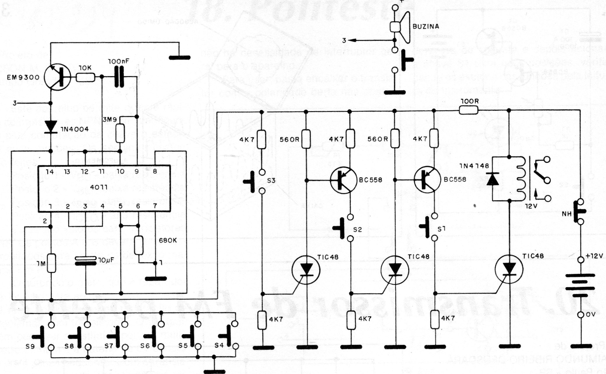 Este circuito de bloqueo codificado con alarma para uso en residencias fue encontrado en una publicación de los años 90. El circuito utiliza componentes que aún son comunes y tanto puede ser alimentado por 12 V proveniente de batería para mayor seguridad y la carga depende sólo del relé utilizado .