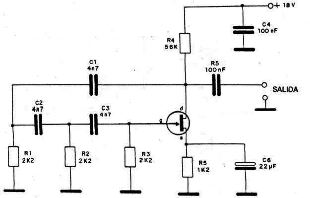 La frecuencia de operación de este oscilador está alrededor de 1 kHz, dependiendo de la tolerancia de los componentes usados. El consumo de corriente es de aproximadamente 0,2 mA y la amplitud de la serial de salida se sima alrededor de 9V (ms). El transistor usado puede ser BF245 o MPF102. La alimentación se hace con tensión de 18V.