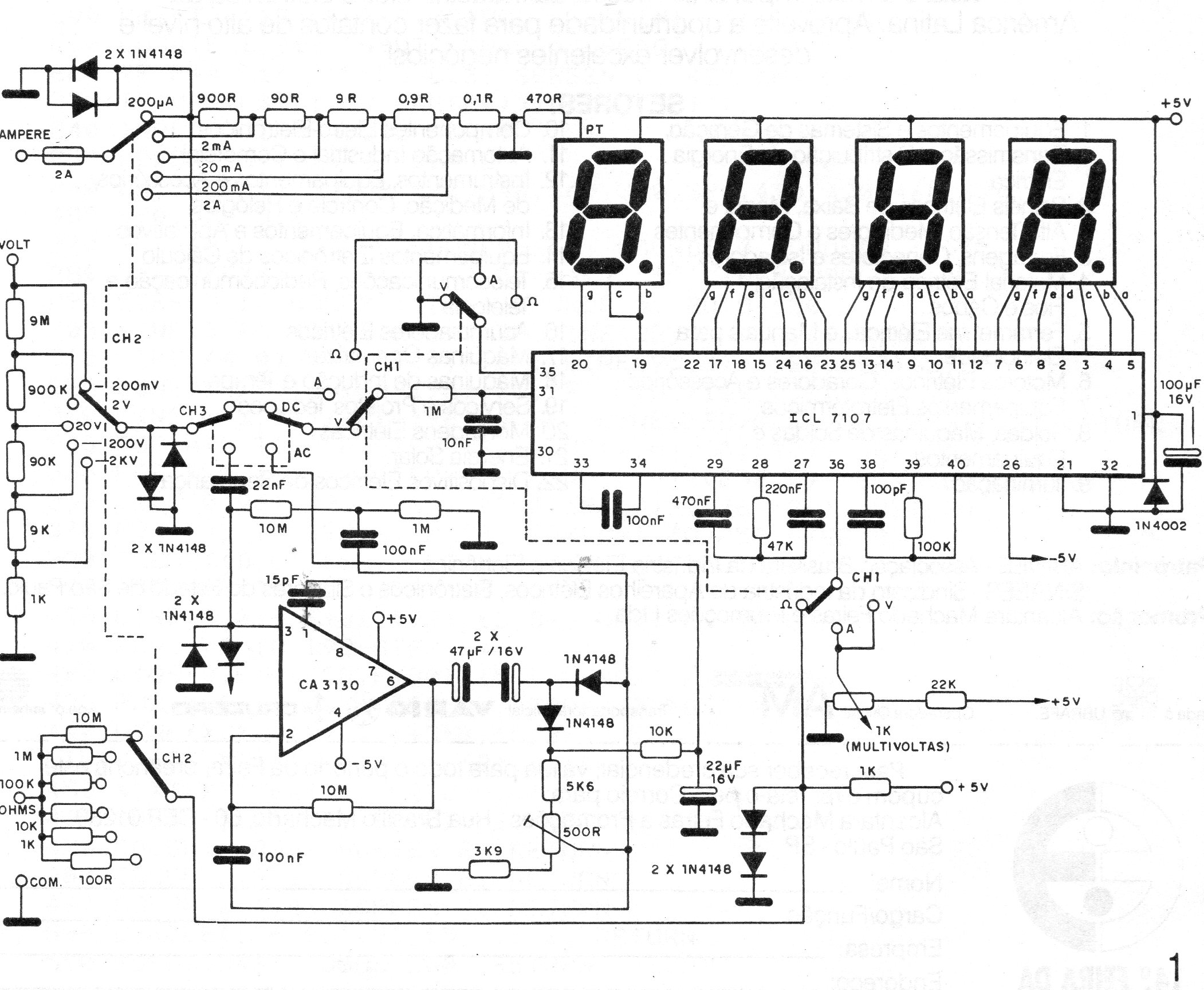 Este circuito se basa en el conocido módulo digital ICL7107 alimentando 4 displays con indicación de 3 y medio dígitos. La precisión depende de la tolerancia de los componentes usados, principalmente resistores en las redes de entrada. El circuito es de una documentación de 1989 y requiere una alimentación simétrica de 5 V.
