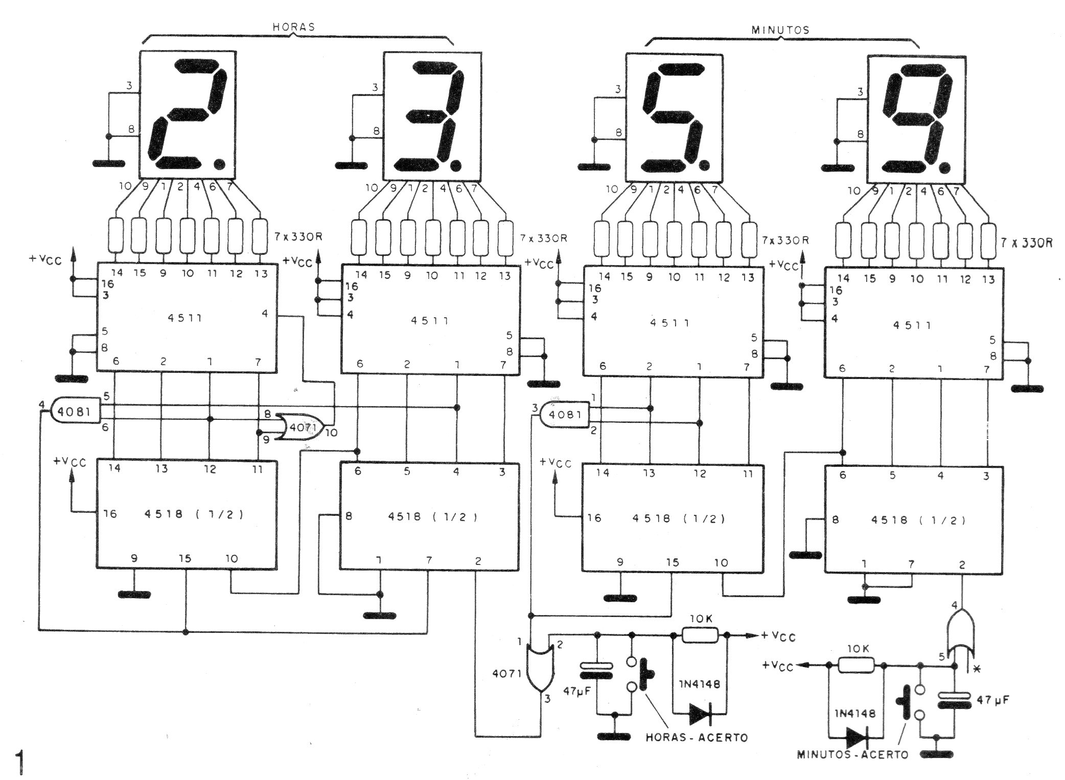 Este reloj digital con circuitos integrados comunes para horas y minutos fue encontrado en una publicación de los años 90. Los displays de 7 segmentos son del tipo cátodo común y los circuitos de tiempo se dan en las figuras 2 y 3. La alimentación debe ser hecha con tensiones de tensión 6 a 9 V.