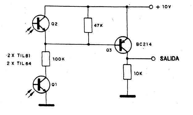 Este circuito tendrá una serial de nivel HI solamente cuando un fototransistor fuera iluminado y el otro no. Sin embargo, la orden de iluminación debe ser observada: el iluminado debe ser Q1. El circuito es sugerido por Texas Instruments y se pueden experimentar equivalentes para los fototransistores.