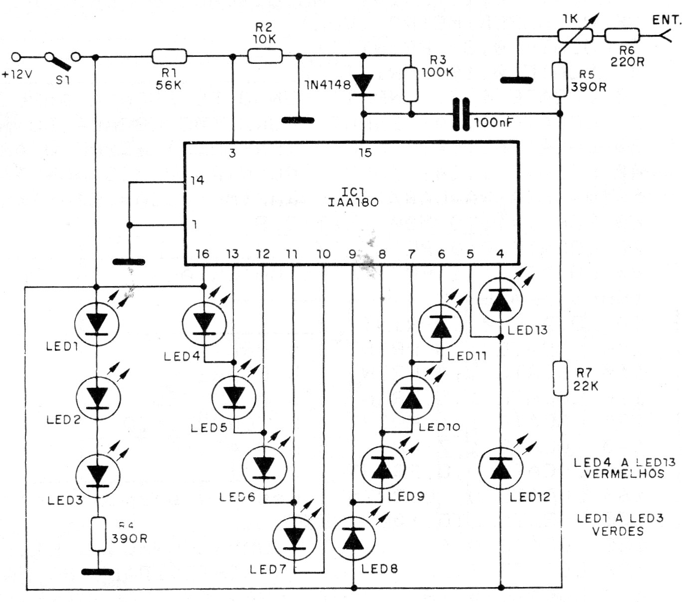 Este circuito hace que un conjunto de LEDs parpadean secuencialmente en un modo que es modulado por la señal de audio aplicada a su entrada. El circuito se puede conectar directamente a la salida de amplificadores comunes y tiene su punto de funcionamiento ajustado en un trimpot. La alimentación de 12 V puede venir de fuente o del propio amplificador. El circuito integrado utilizado es poco común actualmente.