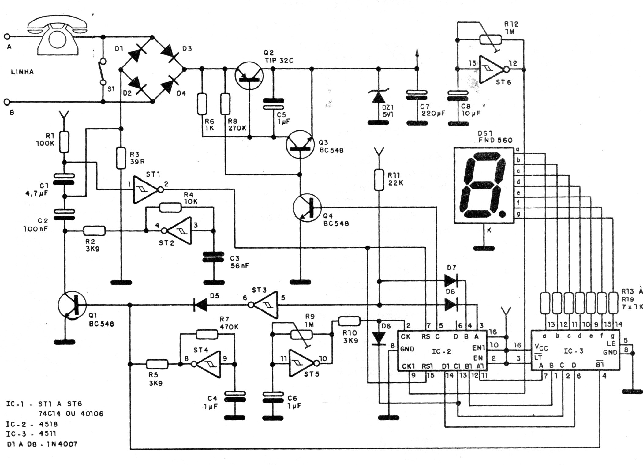 Este circuito marca en un display el número de minutos de una llamada telefónica, entrando en acción cuando el auricular es retirado del gancho. El circuito es de los años 90, usando componentes discretos e integrados CMOS que todavía son comunes en el mercado. El circuito funciona con líneas analógicas de teléfono sólo.