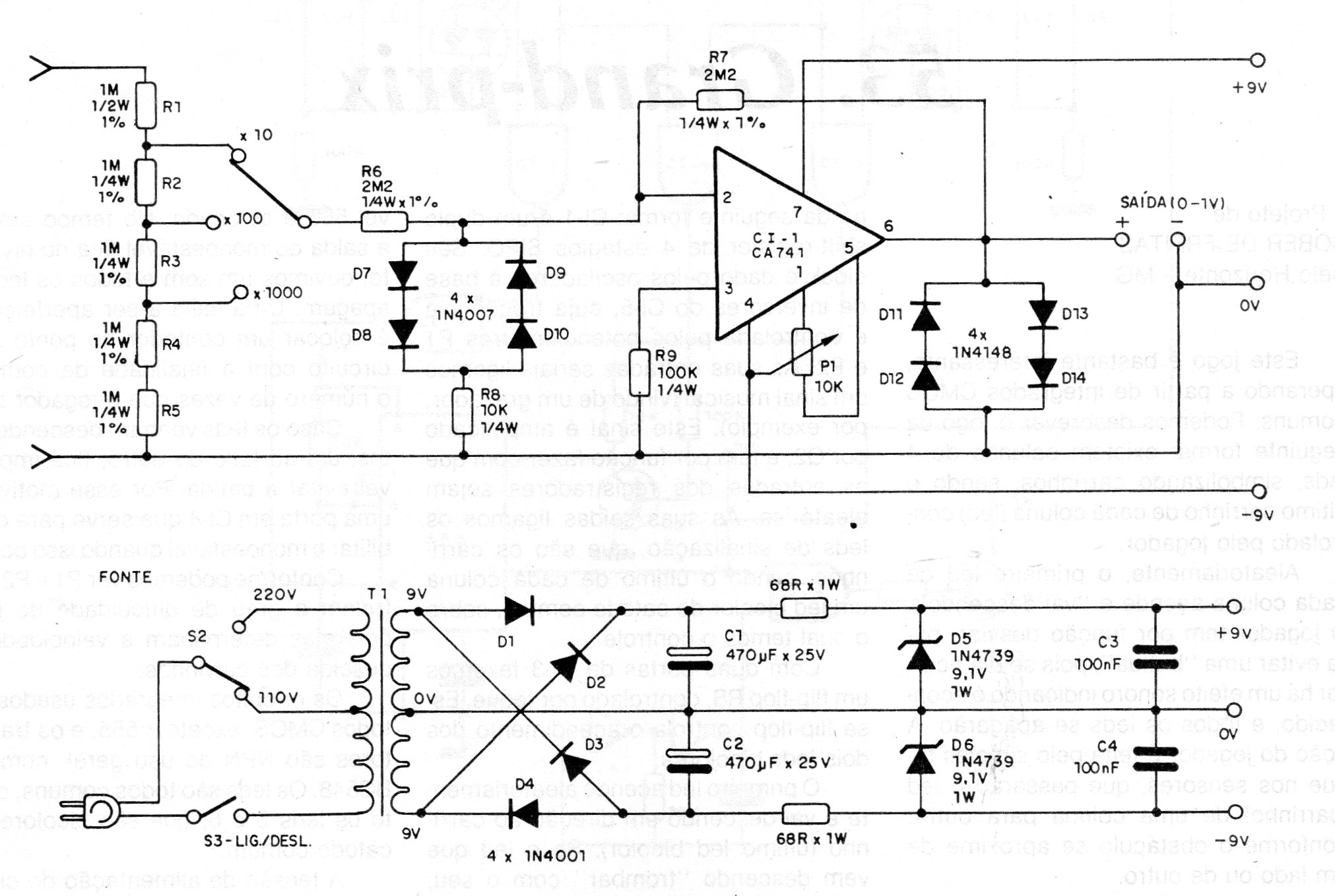 Con este circuito es posible ampliar la escala de tensiones de un multímetro común, aumentando también su sensibilidad y con ello la posibilidad de trabajar con circuitos de alta impedancia. El circuito también tiene su fuente de alimentación simétrica y la precisión depende de la tolerancia de los componentes de entrada (resistores). El circuito es de una documentación de los años 90.