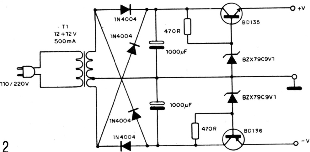 Este circuito fue originalmente diseñado para alimentar la interfaz para MSX del CIR6458S, pero sirve para otras aplicaciones, desde la corriente no es mayor que 500 mA. Los transistores reguladores deben estar dotados de disipadores de calor y el transformador tiene un secundario de 600 mA.