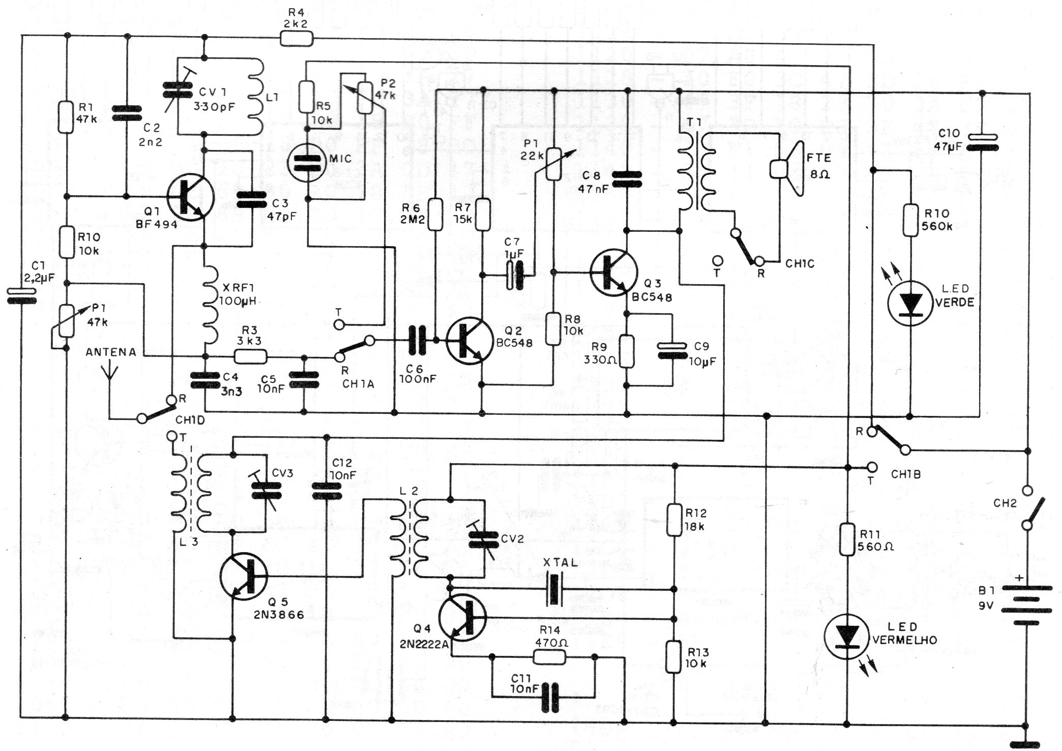 Este circuito de transceptor portátil para el rango de los 11 metros o 27 MHz fue encontrado en una documentación de 1991. El circuito es alimentado por pilas y tiene un alcance de algunos cientos de metros. La bobina L1 consiste en 11 espiras de hilo 18 en forma de 5 mm con núcleo de ferrita ajustable.L2 y L3 consisten en 12 espiras de hilo 28 sobre núcleo de ferrita de 8,5 mm y sobre el primario tenemos un devanado de 3 espiras del mismo hilo.