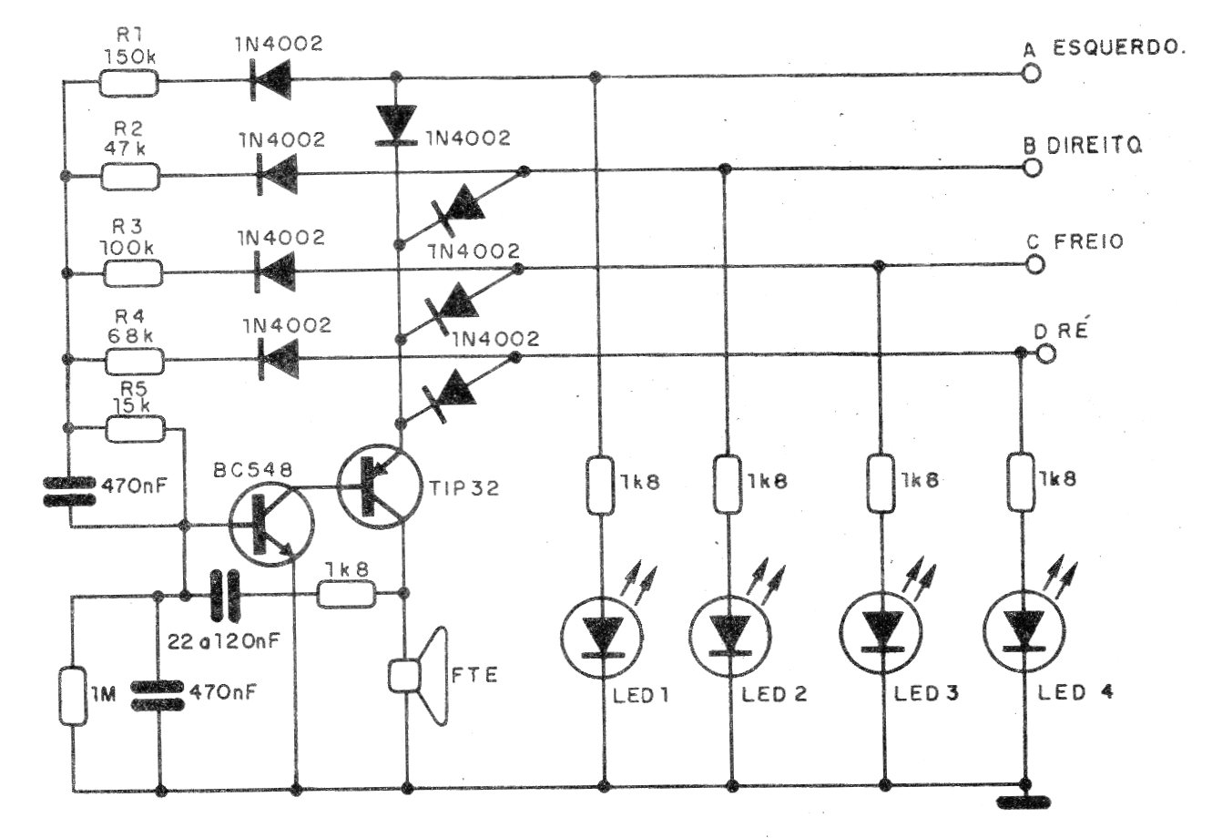 Encontramos este circuito en una documentación de los años 90, pudiendo ser adaptado en la mayoría de los autos de la época. El circuito también se puede utilizar con otras funciones en los coches más modernos o en otras aplicaciones. La frecuencia del sonido emitido en las funciones depende del capacitor de realimentación.