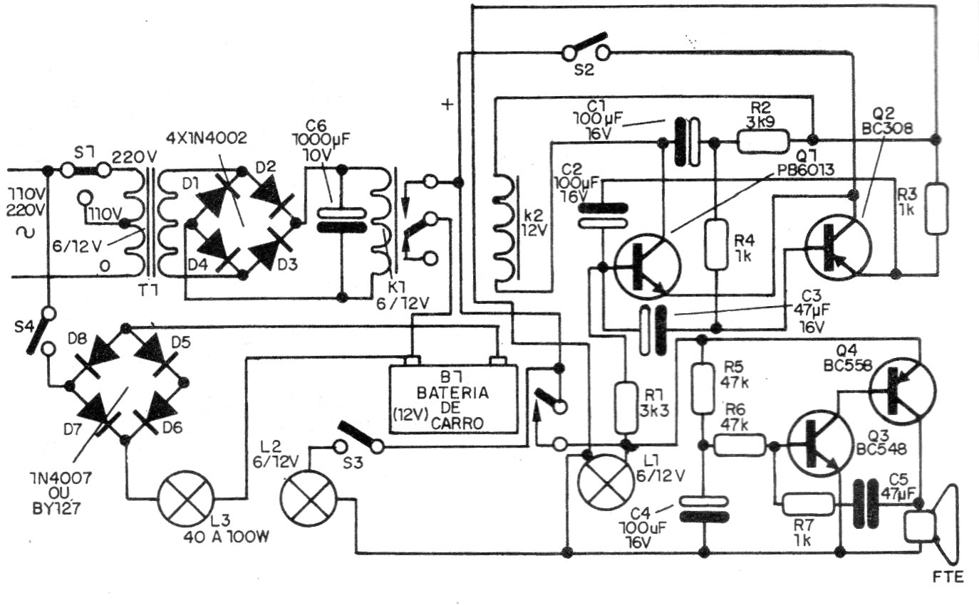 Encontramos este circuito en una documentación de 1991. En lugar de los LEDs el circuito puede ser modernizado con el uso de LEDs blancos de alto brillo y la batería puede ser de tipo más moderno. El circuito incluye el sistema de recarga y el sonido de la alarma se puede cambiar a través de C6.