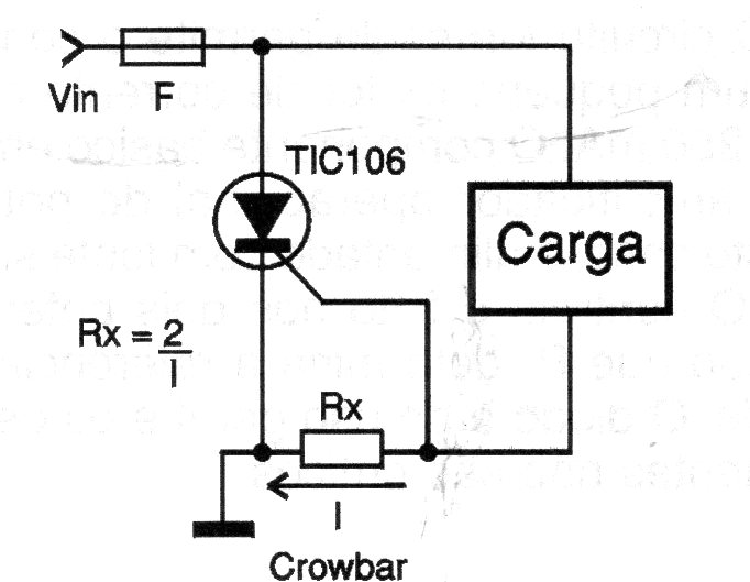 Este circuito de protección contra cortocircuitos acelera la quema del fusible en caso de sobrecorriente en la salida. El circuito es indicado para corrientes hasta unos 3 A y Rx determina el valor del disparo, según fórmula dada en el diagrama. Como la acción es muy rápida, el SCR no necesita disipador.