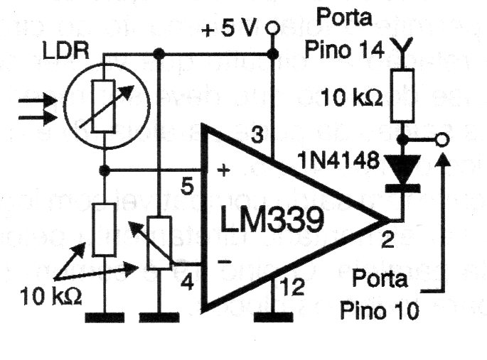 Originalmente, este circuito de una documentación de 2000, fue creado para operar como sensor para el puerto paralelo, sin embargo, puede ser utilizado como escudo para microcontroladores con pocas modificaciones. El ajuste de sensibilidad se realiza en el trimpot de 10 k. El sensor es un LDR común.
