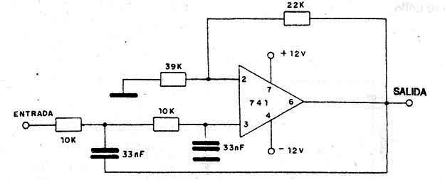 Este filtro está sintonizado para una frecuencia inicial de 500 Hz, par debajo de la cual pasan las demás. La Puente debe ser simétrica y las tolerancias de Valores de los componentes deben ser tenidas en cuenta para el resultado final. Los capacitores de 33 nF determinan la frecuencia de corte de este circuito.