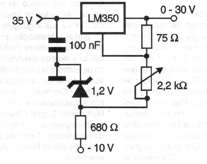 En esta aplicación mostramos cómo obtener regulación a partir de 0 V para un CI regulador LM350. La configuración se aplica también a otros reguladores del mismo tipo. Para esta configuración es necesario contar con una fuente negativa de baja corriente. El integrado debe montarse en un disipador de calor.