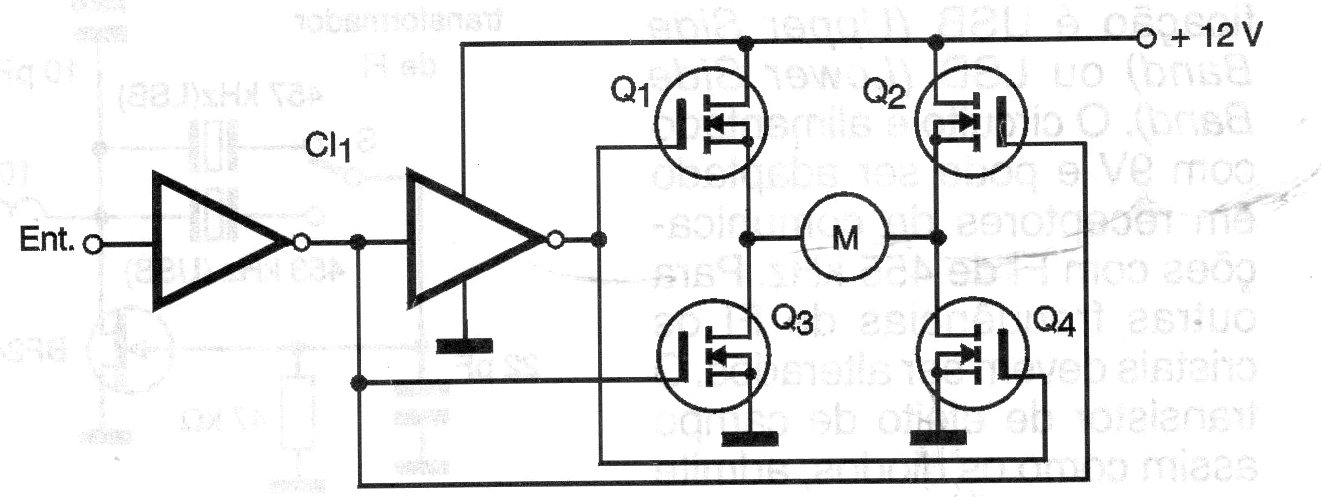 Este circuito de shield para puente H aparece varias veces en aplicaciones en esta sección y en este sitio. En el caso, los inversores pueden ser TTL o CMOS y los MOSFET de cualquier tipo según la potencia del motor que debe ser controlado.