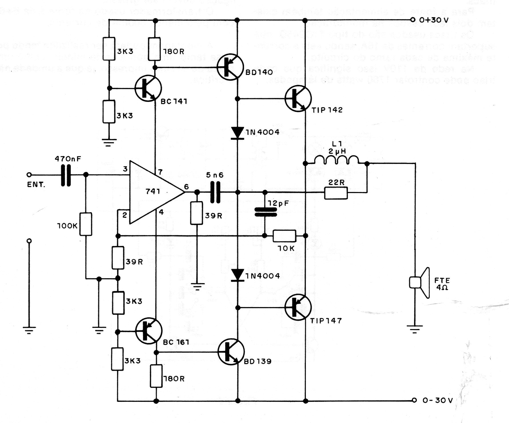 Este excelente amplificador, encontrado en una documentación de 1986 proporciona una buena potencia, siendo alimentado por una fuente simétrica dada junto al diagrama principal. Los transistores deben estar provistos de un buen disipador de calor y el transformador debe tener una corriente de secundario de al menos 3 A.