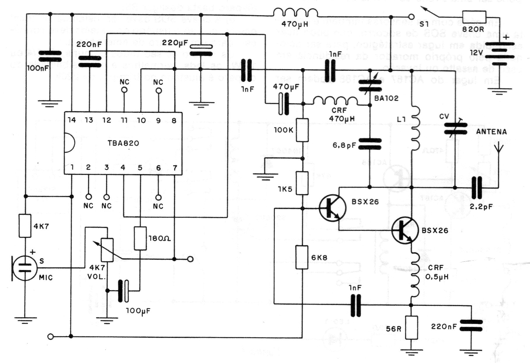 L1 consta de 4 espiras de hilo 22 o 24 en forma de 1 cm sin núcleo. Este transmisor de 1986 tiene buena potencia y necesita una fuente con buen filtrado o batería. El circuito modulador es un amplificador integrado no muy común actualmente que puede ser sustituido por equivalentes modernos.