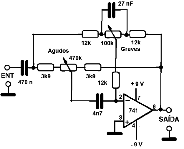 Este circuito se puede añadir al diseño de un amplificador de audio, y consta de un buen control de tono con un amplificador operacional. El amplificador operacional puede ser el 741 o equivalente y la fuente de alimentación simétrica. El circuito se intercala entre la fuente de señal y la entrada del amplificador. Los potenciómetros que se utilizan deben ser lineales. Tenga en cuenta que los cables de entrada y salida de señales deben ser blindados. Para una versión estéreo debe ser montado dos unidades idénticas, una para cada canal. Como el consumo es muy bajo, la alimentación puede obtenerse de propio amplificador con la que el control funcionará. De todas formas, es muy importante para un buen filtro para evitar cualquier ronquidos. Para la versión estéreo, doble operativo como LM1448 LM1548 pueden ser utilizadod.
