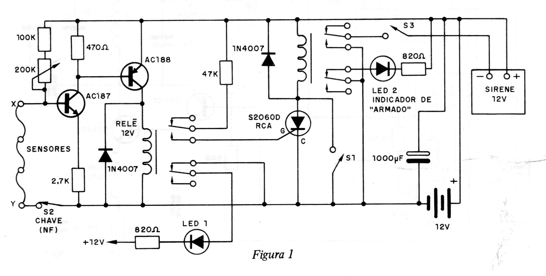 Este circuito fue encontrado en una documentación de 1986. El circuito utiliza relés de 12 V y se alimenta con una batería de 12 V. No está previsto un sistema de carga para la batería. Los sensores de interrupción se pueden colocar en cualquier cantidad.