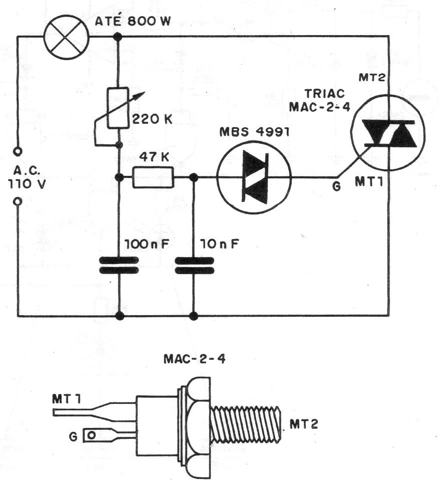 Esta es una configuración de dimmer con triac convencional encontrada en una documentación de 1986. El triac utilizado es un MAC-24 (200 V x 8 A) común en la época, el cual tiene envoltorio para instalación en un gran disipador de calor. El circuito es para la red de 110 V.