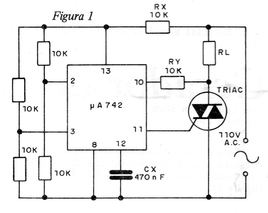 Este circuito de control de fase con triac utiliza un circuito integrado no muy común actualmente. Encontramos esta aplicación en una documentación de 1986. El Triac debe estar dotado de disipador de calor y tener corriente de acuerdo con la carga RL controlada.