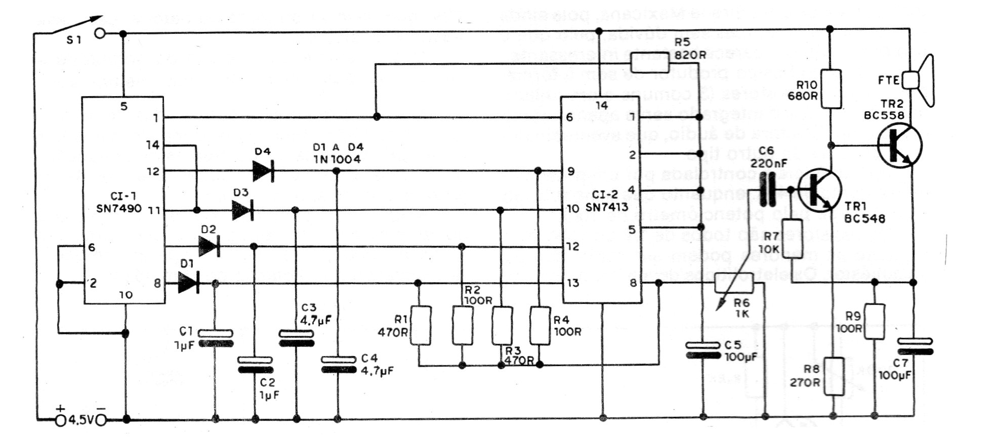 Este simple circuito TTL genera secuencias de notas musicales que pueden ser determinadas por el ajuste de R5 y por los resistores de R1 a R4. El circuito cuenta además con una etapa transistorizada de potencia y como usa tecnología TTL debe ser alimentado con tensiones de 4,5 a 5 V, según lo indicado.