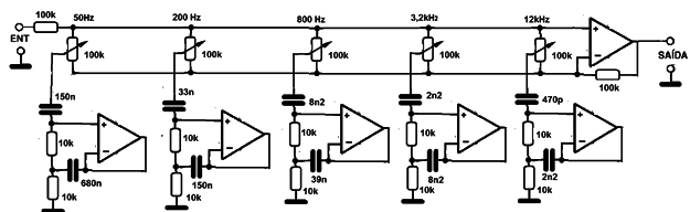 Este circuito debe ser interpuesto entre la fuente de señal y la entrada de grabación o de los circuitos de amplificación. Los amplificadores pueden ser del tipo 741 con fuente de alimentación simétrica y cables de señal blindados. La equiparación de las bandas de frecuencia se indican al lado de cada bloque. En este tipo de ecualizador, la atenuación y refuerzo de cada banda de frecuencia se pueden ajustar por separado. En este circuito específicamente tenemos 5 canales, cuyas frecuencias se indican al lado de cada potenciómetro de ajuste, que debe ser lineal. Los operacionales son todos tipo 741, pero se puede utilizar versiones dobles. La fuente de alimentación debe ser simétrica 6 + 6 + 15 V a 15 V con una excelente filtración. Una fuente de alrededor de 100 mA es suficiente para alimentar el circuito desde que su consumo es muy bajo. Para un equipo estéreo se deben instalar dos unidades de este tipo, uno para cada canal. La fuente de alimentación puede ser única.