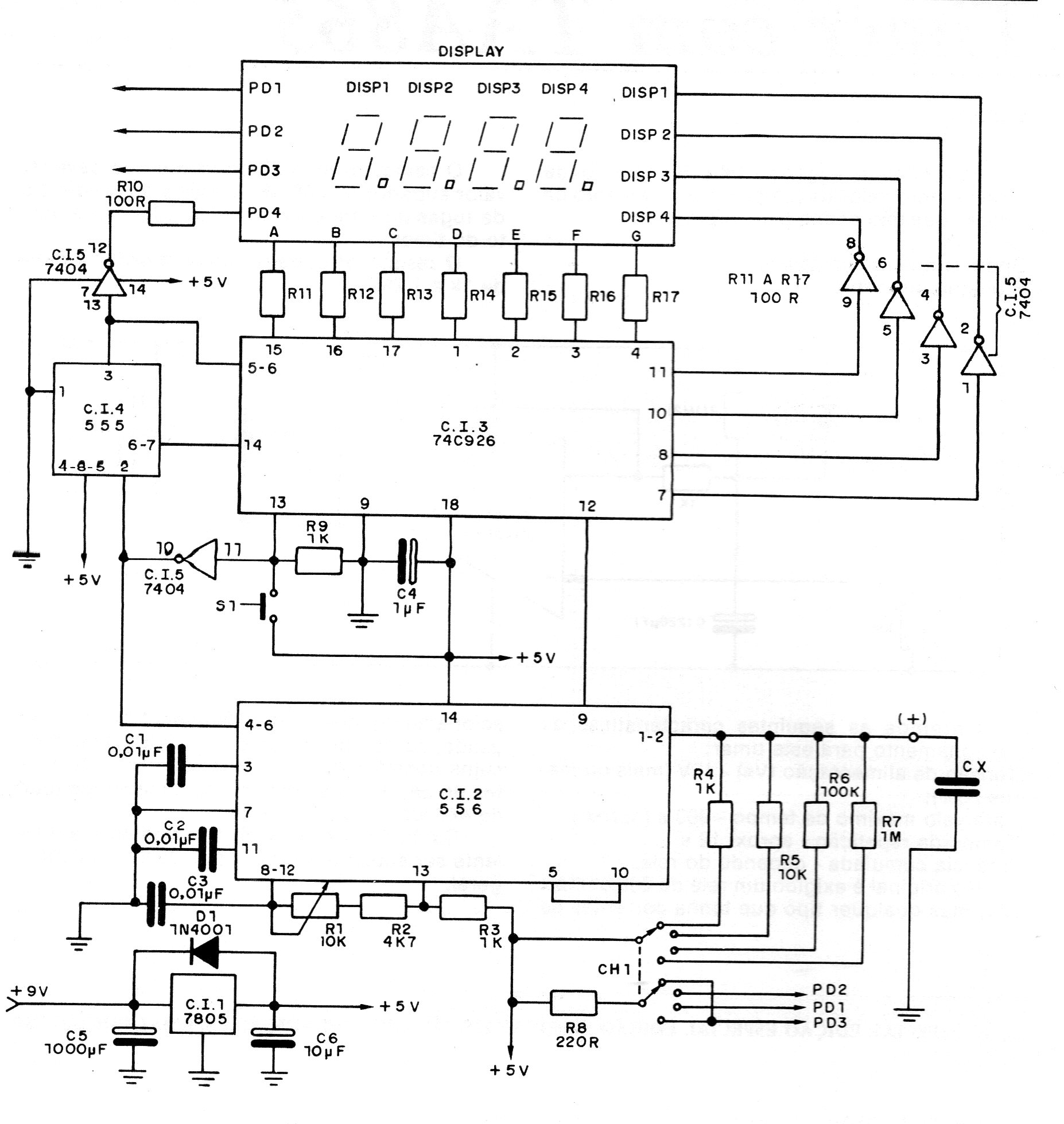 Este circuito fue encontrado en una documentación de 1986 pudiendo haber cierta dificultad para la obtención de algunos de sus componentes. El circuito es TTL debiendo ser alimentado con 5 V. La calibración de las diversas escalas debe ser hecha en R1 y la precisión depende de las resistencias usadas.