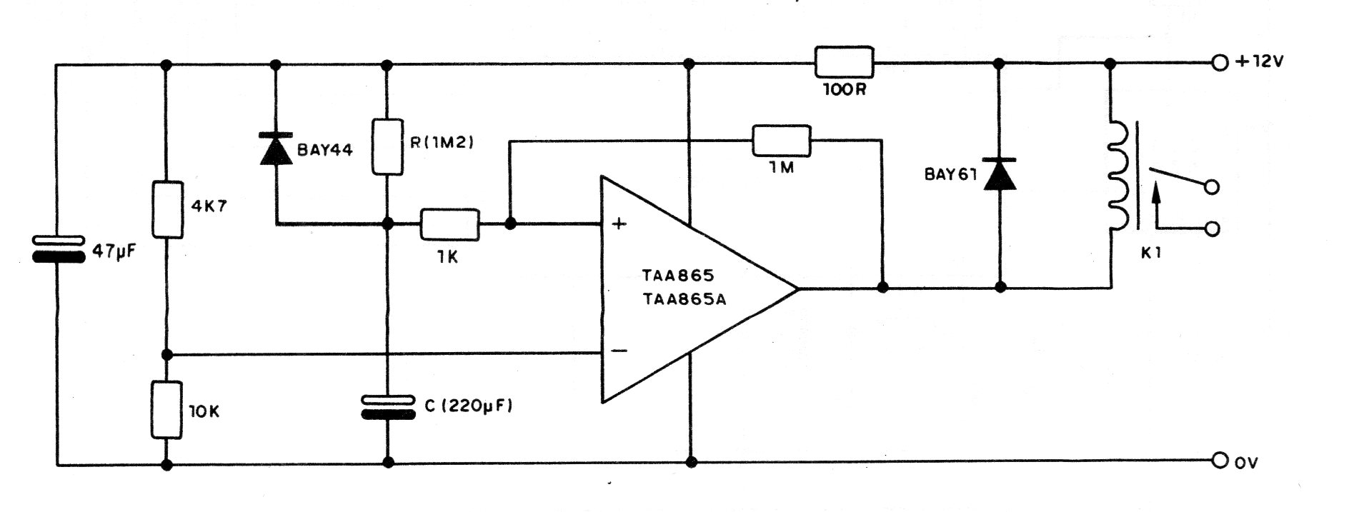 El circuito integrado TAA865 usado en este proyecto de 1986 no es más común en nuestros días. El circuito es de una documentación de la época y el tiempo es dado por RC que tiene indicados los valores máximos. Se puede utilizar un pote para R.