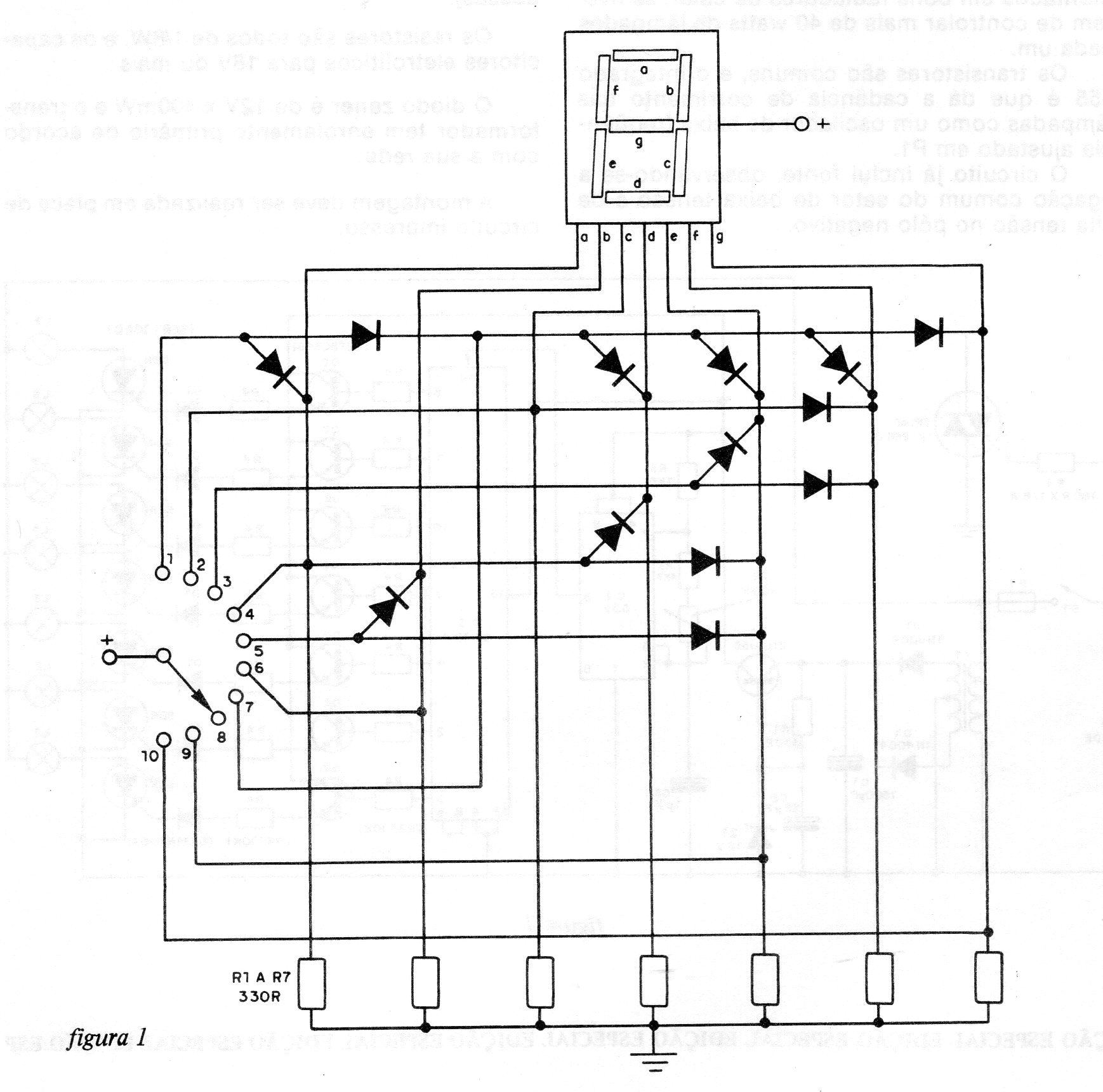 Este circuito didáctico hace el accionamiento secuencial de 0 a 10 para demostrar el funcionamiento de un display de 7 segmentos. La alimentación es de 5 o 6 y los diodos pueden ser 1N4148 o cualquier tipo de uso general.