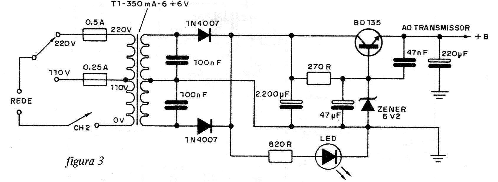 Este circuito está indicado para la alimentación del transmisor CIR736. El BD135 debe tener un pequeño radiador de calor y el zener eventualmente puede tener una tensión mayor.