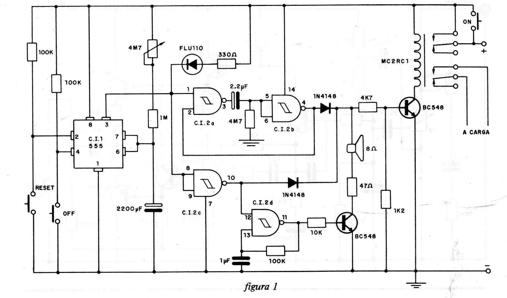 Este circuito es de una publicación de 1986. Su finalidad es apagar automáticamente un televisor después de cierto tiempo, lo que puede ser interesante si el lector suele dormir viendo TV. El circuito se autodesliga también y para rearmar basta presionar un interruptor de presión de rearme. El tiempo de hasta más de 1 hora se ajusta en el potenciómetro.