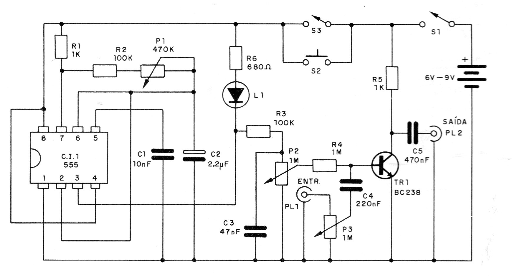 Este circuito fue encontrado en una publicación de 1986. La velocidad del efecto es determinada por el 555, siendo ajustada en P1. El circuito tiene diversos ajustes, como intensidad del efecto y atenuación de agudos. Los cables de entrada y salida de señales deben ser blindados.