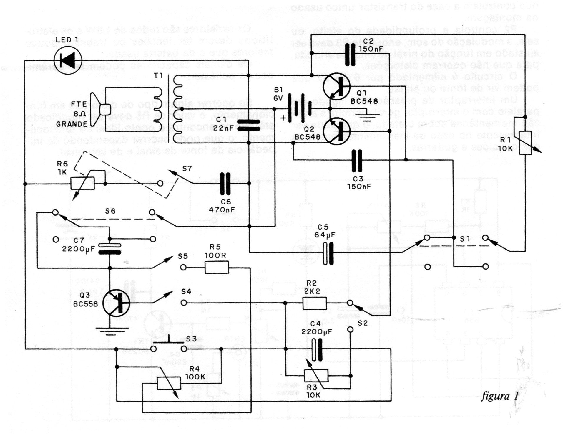 El transformador de este proyecto encontrado en una documentación de 1986 es del tipo de salida, encontrado en viejos radios transistorizados. El circuito produce diversos tipos de sonidos que son creados por la selección de las posiciones de las llaves y potenciómetros.