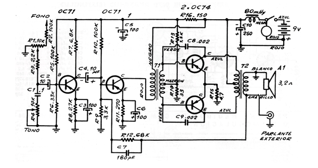 Este es el circuito de un amplificador de un tope o de un reproductor portátil alimentado por pilas de los años 1970. Las pilas deben ser medianas o grandes y los transistores son tipos antiguos de germanio. Se pueden hacer cambios de polarización para utilizar los equivalentes de silicio modernos. Los transformadores se pueden encontrar en radios y amplificadores fuera de uso hechos en la misma época.