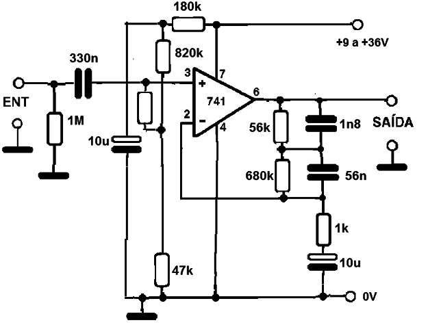 La configuración de este circuito fue sugerida por una vieja publicación Inglesa que trata de proyectos con el amplificador operacional 741. Como el 741 sigue siendo muy popular hoy en día, la viabilidad del proyecto sigue. El circuito está pensado originalmente para micrófonos de cristal, pero ya no existe este tipo. Sin embargo, sus características permiten su uso con micrófonos de cerámica de alta impedancia. La fuente no tiene que ser simétrica. Lo consumo de la unidad es bajo, del orden de unos pocos miliamperios. La impedancia de salida es de 1 k, y el nivel de señal suficiente para excitar los amplificadores más comunes. El consumo es muy bajo, lo que permite su uso con la batería. Cables de entrada y señales de salida deben estar blindados, esta fuente se utiliza, debe tener una excelente filtración.