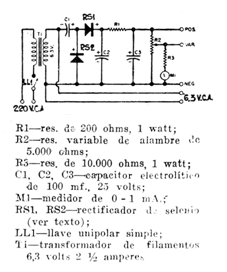 Con este circuito, de una publicación argentina de 1973, se pueden obtener 12 V continuos de salida con un transformador de 6 V. Los diodos pueden ser los 1N4002 o 1N4004 y el potenciómetro R2 debe ser de 4k7 de hilo. La corriente del secundario del transformador es de 500 mA a 2 A. R1 puede ser de 220 ohms x 1 W.